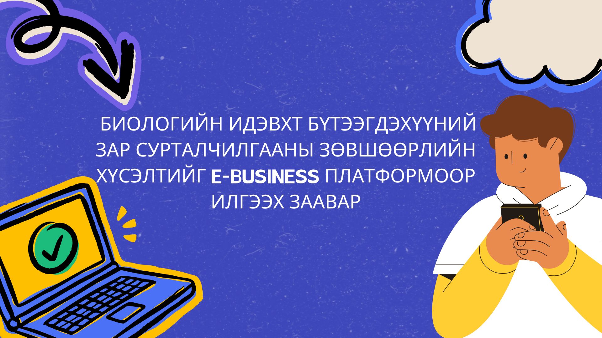Эм, эмнэлгийн хэрэгслийн хяналт, зохицуулалтын газрын Биологийн идэвхт бүтээгдэхүүний зар сурталчилгаа зөвшөөрөл олгох, Жоргүй олгох эмийн бүтээгдэхүүний зар сурталчилгаа зөвшөөрөл олгох 2 үйлчилгээ www. e-business.mn платформд нэвтэрлээ. ...