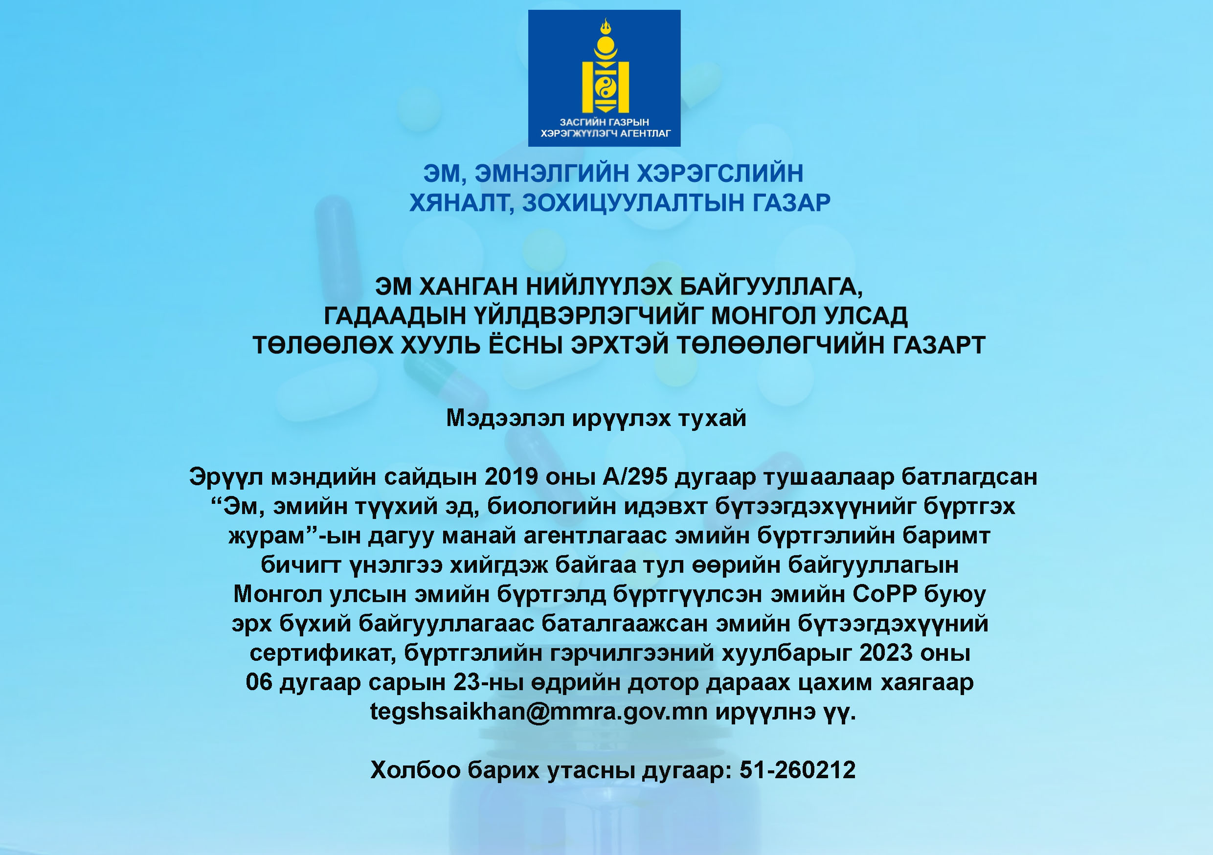 ЭМЯ-ны Хүний эмийн зөвлөлийн Эм судлалын салбар зөвлөлийн хурлаар баталгаажсан хэрэглэх зааврын мэдээллийг https://mmra.gov.mn/?id=1246 цахим хаягаар нэвтэрч авна уу! ...