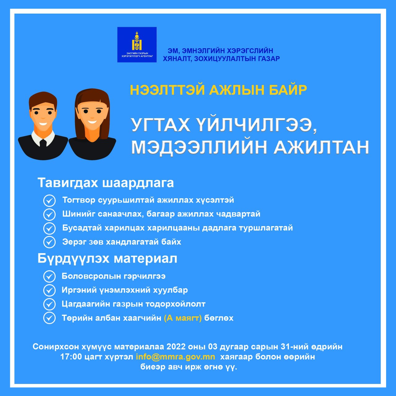 Ажлын байрны чиг үүргийн дагуу агентлагийн УГТАХ ҮЙЛЧИЛГЭЭ, МЭДЭЭЛЛИЙН АЖИЛТАН нь үйлчлүүлэгчдийг угтах, шаардлагатай мэдээллээр хангах, чиглүүлэх, дотоод хурал, үйл ажиллагааг зохицуулах ажлыг гүйцэтгэнэ.