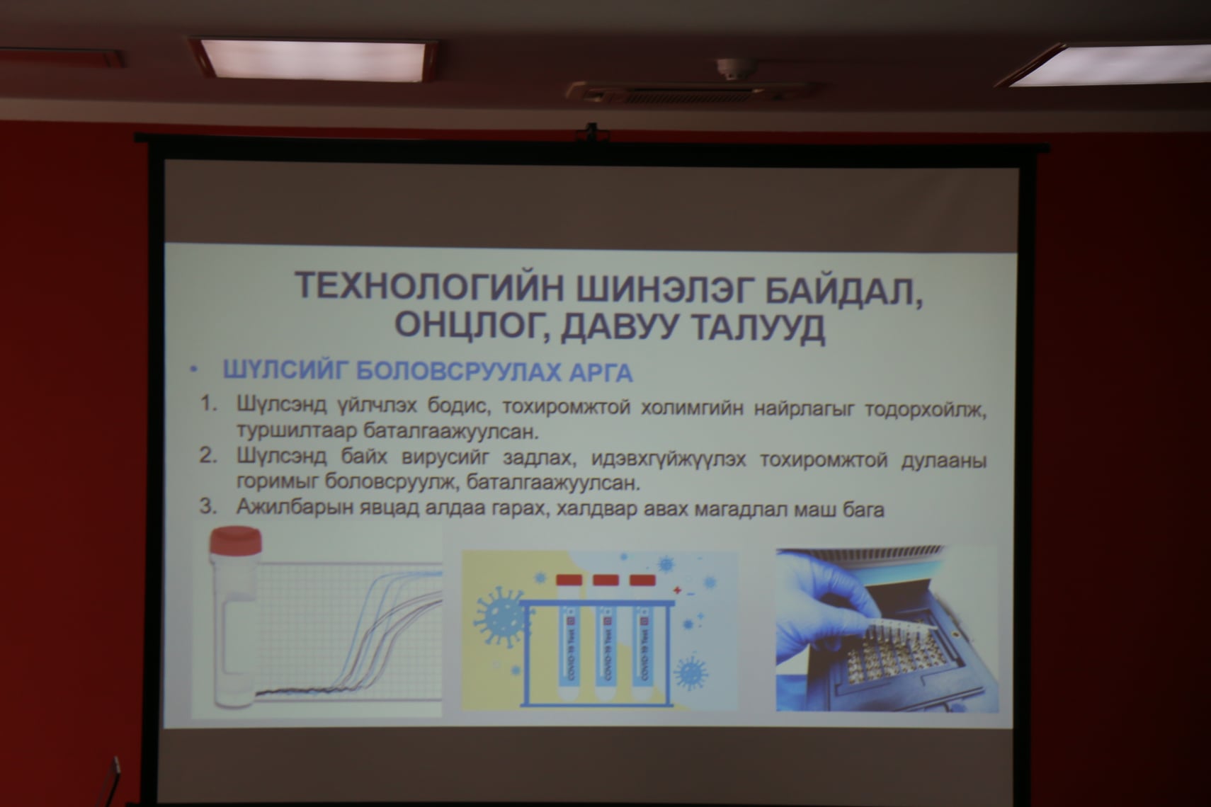 Боловсрол, Соёл, Шинжлэх Ухааны Яамны захиалгаар АШУҮИС, БАС, НЭМС, Молекул биологи удамзүйн тэнхим, Дархлаа судлалын тэнхим, АУХ, Эрдэм шинжилгээний төв лаборатори, Шим тэжээл судлалын тэнхим болон эрдэмтэн, судлаачид хамтран SARS-CoV2-ыг шүлсэнд илрүүлэх шинэ ПГУ оношлуурыг бүтээжээ. Нийт 10 гаруй хүний бүрэлдэхүүнтэй шинжлэх ухаан, технологийн төслийн багийнхны бүтээсэн in-house үндэсний үйлдвэрийн оношлуурыг ЭМЯ, Улсын онцгой комиссын өгсөн чиглэлийн дагуу оношлуурын салбар зөвлөлийн гишүүд ЭЭХХЗГ-т хуралдаж, оношлуурын бүртгэлд албан ёсоор бүртгэлээ. Уг оношлуурын нэгж өртөг нь одоо ашиглаж байгаа PCR оношлуураас 2-3 дахин бага бөгөөд ирэх сарын 1-ний өдрөөс хэрэглээнд бүрэн нэвтрүүлэх аж.