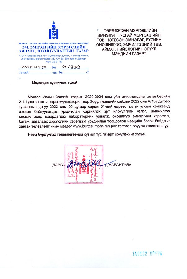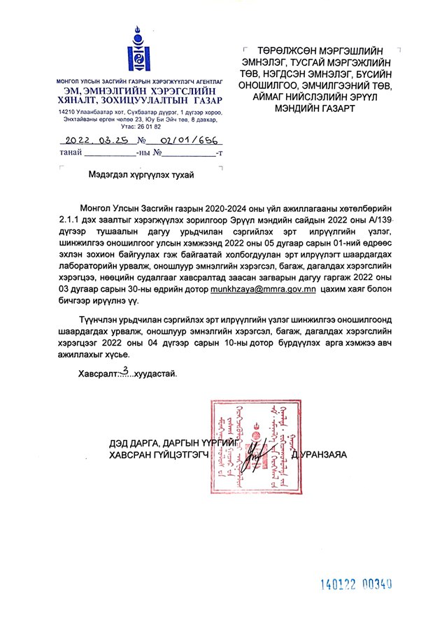 Эрүүл мэндийн сайдын 2022 оны А/139 дүгээр тушаалаар “Хүн амын нас, хүйс, эрүүл мэндийн эрсдэлд суурилсан зонхилон тохиолдох халдварт болон халдварт бус өвчнөөс урьдчилан сэргийлэх, эрт илрүүлэх, үзлэг, шинжилгээ, оношилгоог зохион байгуулах журам” батлагдсан.