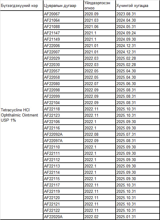 • ДЭМБ нь Эмийн зохицуулалтын байгууллагууд, эмнэлгийн мэргэжилтнүүд болон олон нийтэд БНЭУ-ын “Галентик Фарма Pvt” үйлдвэрлэгчийн (Хаяг: R-673, T.T.C. MIDC Rabale, Thane-Belapur Road, Navi Mumbai – 400701, Maharashtra) Тетрациклины гидрохлоридын USP 1% нүдний тосон түрхлэгийн хүснэгт 1, 2 – т заасан бүх цувралыг илрүүлж, зах зээлээс эргүүлэн татахыг зөвлөж байна.
