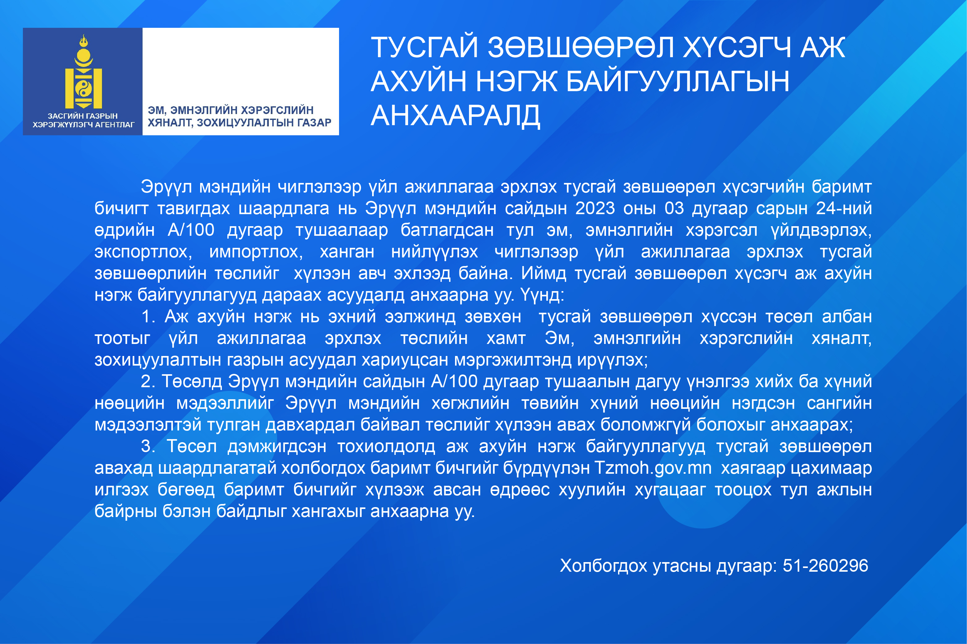 Тусгай зөвшөөрөл хүсэгч аж ахуйн нэгж байгууллагуудын анхааралд