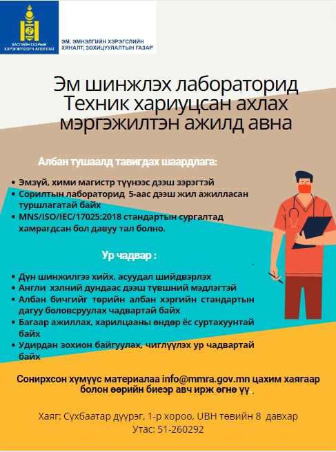 Эм шинжлэх лабораторид Ариутгал, устгалын ажилтан ажилд авна. Ажиллах нөхцөл: Хөлсөөр ажиллах гэрээ байгуулна. Сонирхсон хүмүүс материалаа info@mmra.gov.mn цахим хаягаар болон өөрийн биеэр авч ирж өгнө үү. Хаяг: Сүхбаатар дүүрэг, 1-р хороо, UBH төвий ...