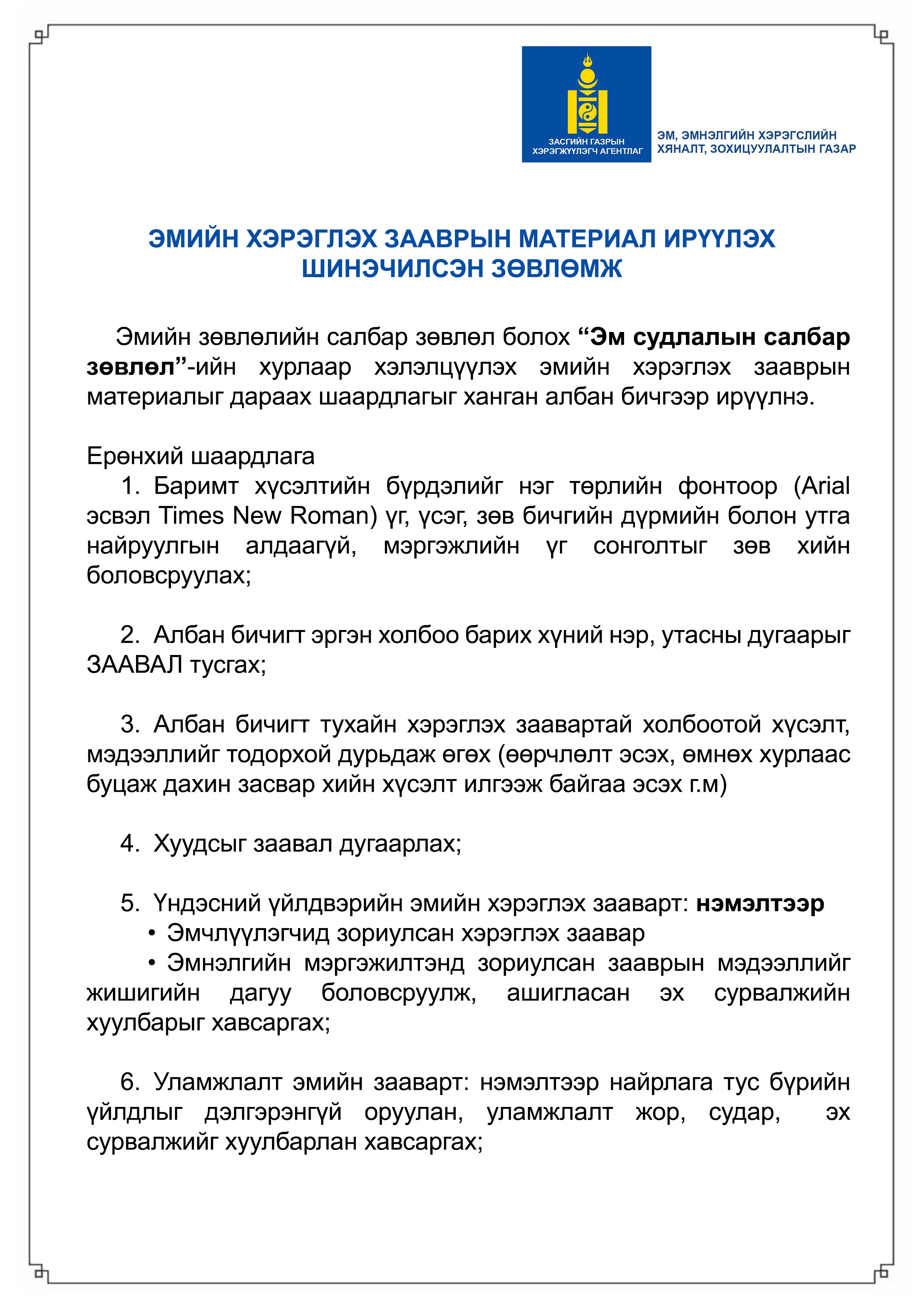 ЭССЗ-ИЙН №6 ДУГААР ХУРЛААР ХЭЛЭЛЦЭН БАТЛАХААР ШИЙДВЭРЛЭСЭН ЭМИЙН ХЭРЭГЛЭХ ЗААВАР