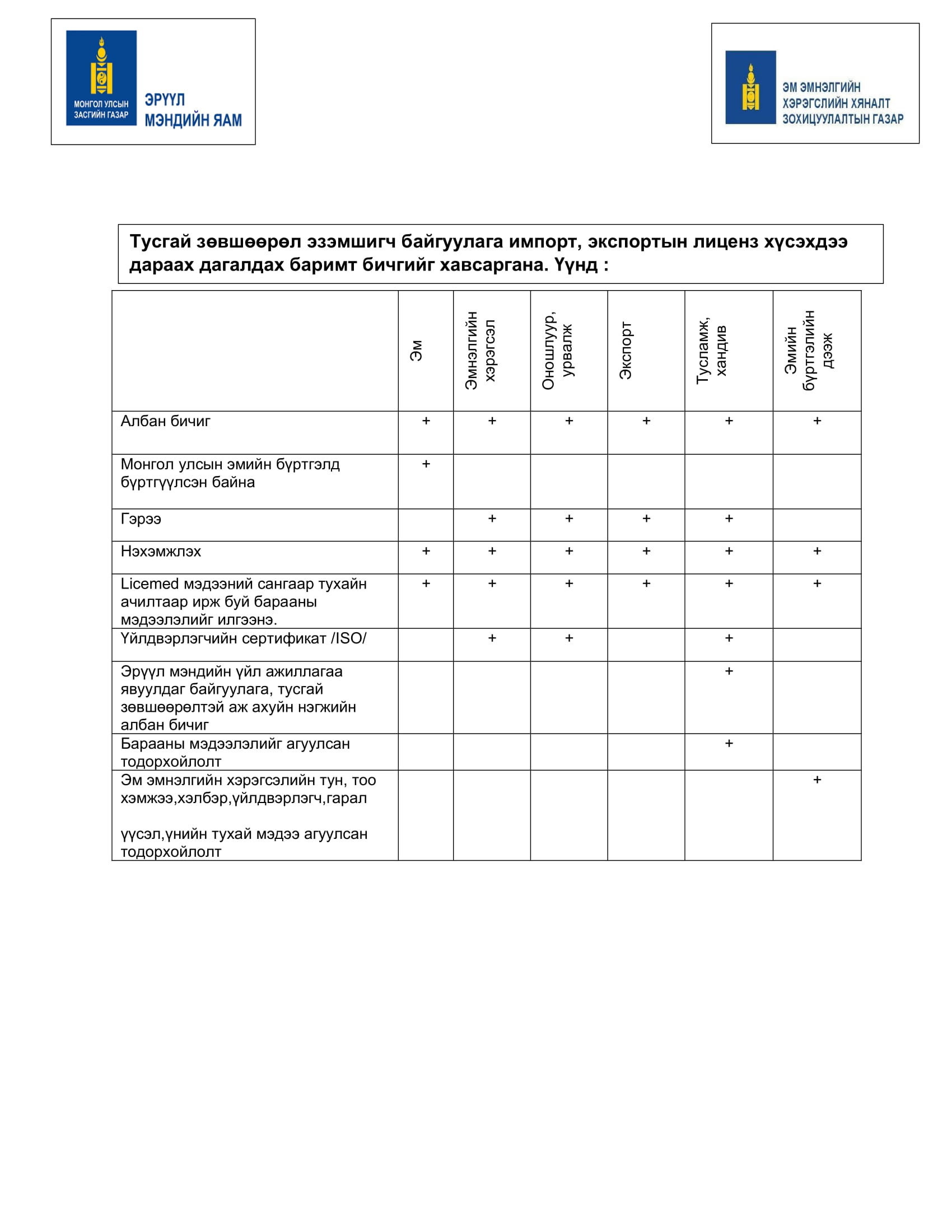 Тусгай зөвшөөрөл эзэмшигч байгууллага импорт, экспортын лиценз хүсэхэд дагалдах баримт бичгийн материал